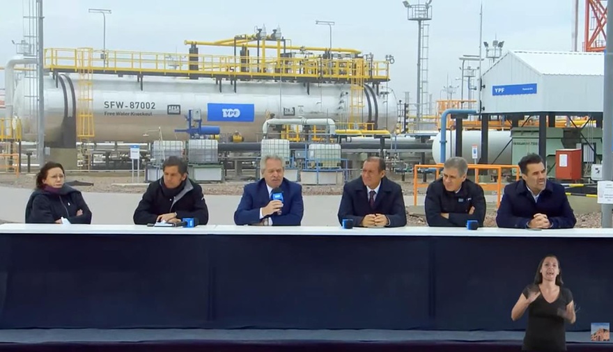 En la mesa, junto a Fernández, se sentaron la directora de la Fundación YPF, Ofelia Cédola; el gobernador de Buenos Aires, Axel Kicillof; el gobernador de Neuquén, Omar Gutiérrez; el director de YPF, Pablo González y el secretario de energía de la Nación, Darío Martínez.
