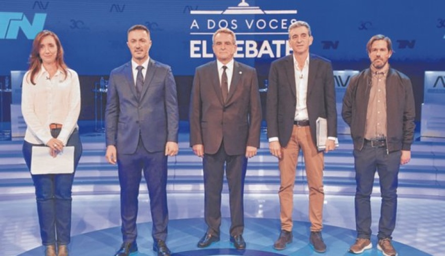 Agustín Rossi, de Unión por la Patria (UxP); Luis Petri, de Juntos por el Cambio (JxC); Victoria Villarruel, de La Libertad Avanza (LLA); Nicolás del Caño, del Frente de Izquierda; y Florencio Randazzo, de Hacemos por Nuestro País (HxNP), expusieron sus propuestas convocados por el programa "A dos voces" en el canal de cable Todo Noticias (TN), en torno a tres ejes temáticos: economía, inflación y trabajo; rol del Estado y conflictividad social; y política de seguridad, defensa y justicia".