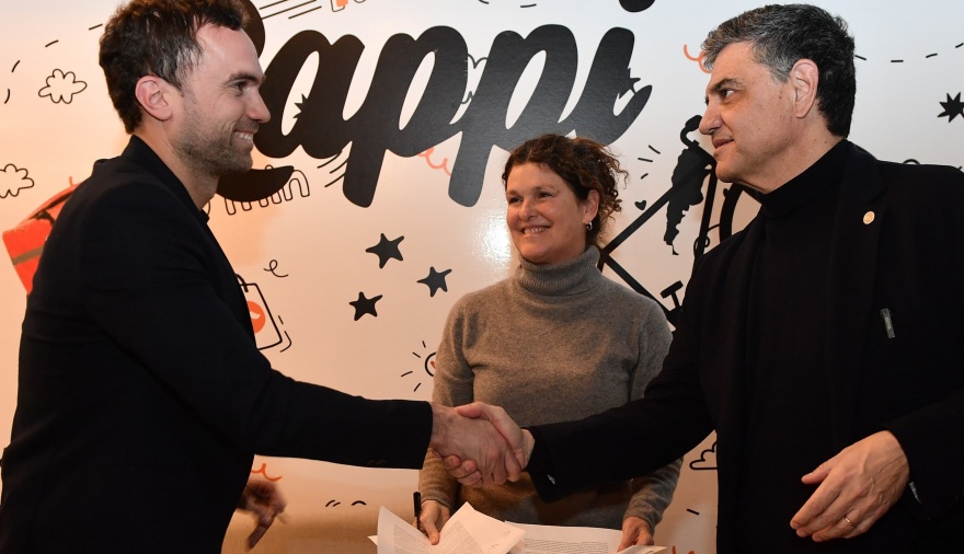 En las nuevas oficinas de la empresa Rappi en Saavedra, el jefe de Gobierno y la ministra de Cultura, Gabriela Ricardes, cerraron el convenio con directivos de la plataforma tecnológica que hará el envío a domicilio de los libros.