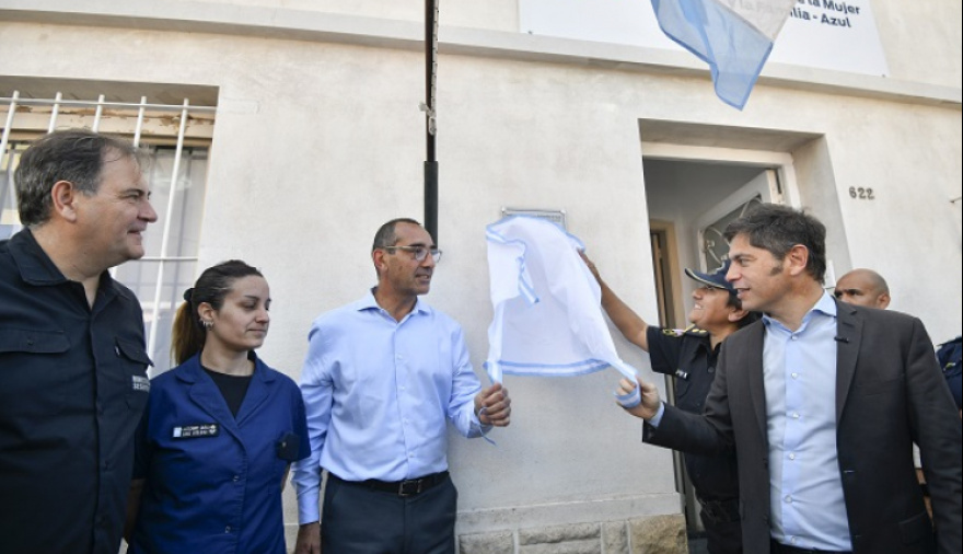El gobernador bonaerense, Axel Kicillof, visitó Azul donde inauguró un nuevo edificio para la Comisaría de la Mujer y Familia y efectuó la entrega de unidades móviles para fortalecer el patrullaje en el municipio, junto al ministro de Seguridad, Javier Alonso; y el intendente local, Nelson Sombra.